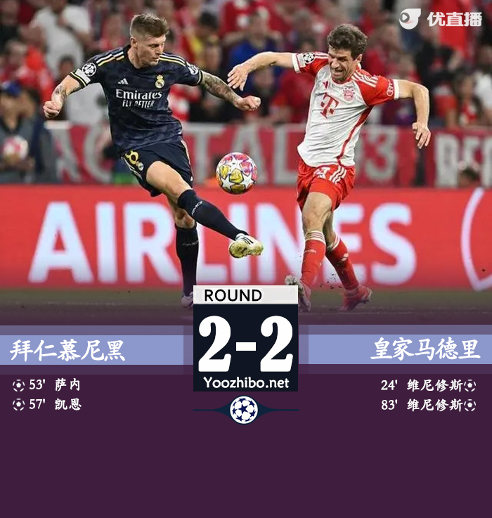 jrs直播网讯:北京时间5月1日3:00,欧冠半决赛首回合,拜仁慕尼黑主场vs皇家马德里。上半场,克罗斯手术刀直塞助攻维尼修斯破门!半场结束,皇马客场暂时1-0领先拜仁。下半场,萨内内切爆射近角扳平比分!穆西亚拉造点凯恩点射!拜仁4分钟2球反超皇马;金玟哉送点,维尼修斯主罚扳平比分!最终,拜仁主场2-2皇马,双方握手言和,次回合移师伯纳乌决战!