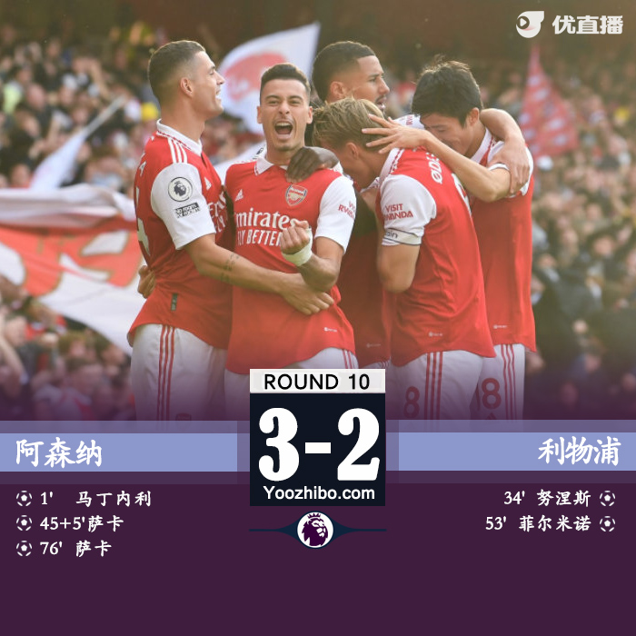 jrs直播网讯北京时间10月9日23点30分,英超第10轮焦点战阿森纳主场对阵利物浦。上半场开场1分钟马丁内利闪击破门,努涅斯铲射扳平比分,迪亚斯伤退,萨卡补时阶段打进一球。下半场,厄德高错失良机,菲尔米诺再度扳平比分,热苏斯造点,萨卡点射破门,全场比赛结束,阿森纳3-2利物浦。