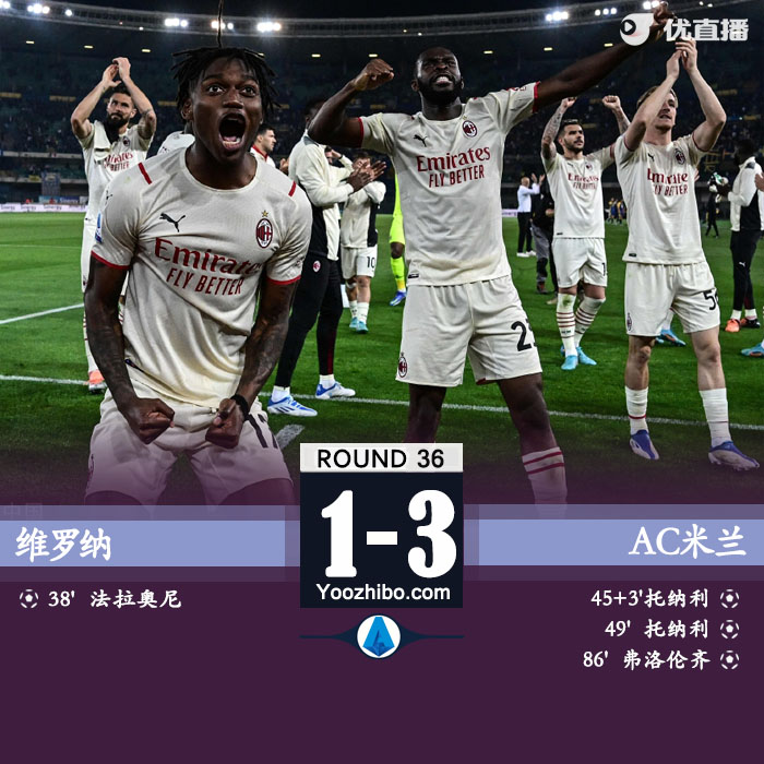 jrs直播网讯5月9日讯 北京时间5月9日凌晨2点45分,2021-22赛季意甲第36轮在本特戈蒂球场展开角逐,AC米兰客场挑战维罗纳。上半场法拉奥尼先拔头筹,莱奥助攻托纳利扳平,下半场莱奥再次助攻托纳利反超,弗洛伦齐替补锁定胜局。最终AC米兰客场3-1逆转维罗纳,积分榜方面,AC米兰积80分领先国米2分,重回榜首,维罗纳积52分位列第9。