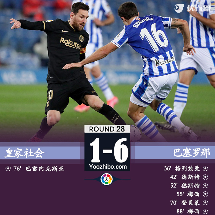 jrs直播网3月22日讯 北京时间3月22日星期一04:00,西甲第28轮皇家社会主场迎战巴塞罗那。上半场,格列兹曼首开记录,梅西助攻德斯特扩大比分。下半场,德斯特破门完成双响,梅西梅开二度,登贝莱建功,巴雷内切亚扳回一城。最终,巴萨6-1皇家社会迎5连胜,积分榜升至联赛第二位。