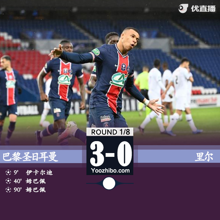 jrs直播网3月18日讯 北京时间3月18日00:45,法国杯1/8决赛,巴黎圣日耳曼主场对阵里尔。上半场比赛,伊卡尔迪推射破门,随后受伤被换下场,姆巴佩造点并亲自主罚命中。下半场比赛,库尔扎瓦手球送点,亚兹奇点球被纳瓦斯扑出,姆巴佩单刀挑射破门。最终全场比赛结束,巴黎圣日耳曼主场3-0战胜里尔,成功晋级法国杯八强。