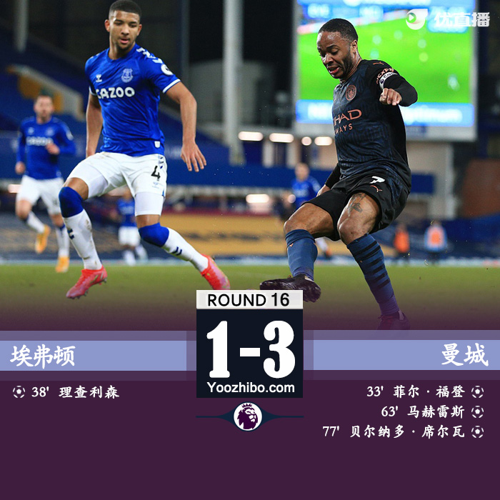 jrs直播网2月18日讯 北京时间2月18日凌晨4:15,英超联赛第16轮一场补赛打响,曼城做客挑战埃弗顿。上半场,米纳受伤离场,福登先拔头筹,理查利森扳平比分。下半场,马赫雷斯世界波破门,B席远射再下一城。全场比赛结束,曼城3-1力克埃弗顿,各项赛事豪取17连胜。