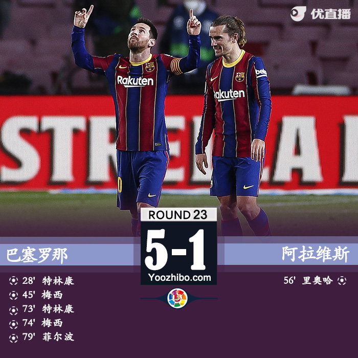 jrs直播网2月14日讯 北京时间2月14日04:00,西甲第23轮继续进行,巴塞罗那主场迎战阿拉维斯。上半场,莫里巴助攻特林康破门帮巴萨取得领先,梅西世界波扩大比分。下半场,里奥哈利用莫里巴的传球失误扳回一球,特林康和梅西连入两球锁定胜局,菲尔波锦上添花。最终,巴塞罗那5-1大胜阿拉维斯,取得七连胜升至第2位。