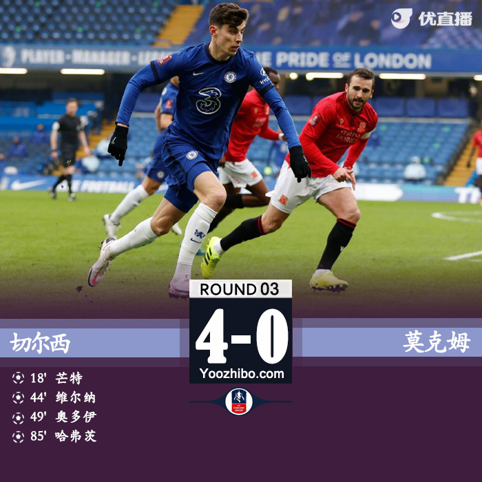 jrs直播网1月10日讯 北京时间1月10日22:00,足总杯第3轮一场比赛在切尔西与英乙球队莫克姆之间进行。上半场菲利普斯冷射考验凯帕,芒特远射破门,哈弗茨助攻维尔纳打破12场球荒。下半场奥多伊再下一城,哈弗茨建功。最终切尔西4-0大胜莫克姆晋级足总杯第四轮。