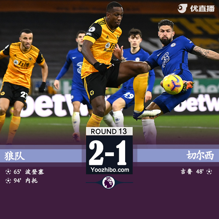 jrs直播网讯:北京时间12月16日02:00(英国当地时间15日18:00),2020/21赛季英超第13轮一场焦点战在莫利纽克斯球场展开争夺,切尔西客场1比2不敌狼队,吉鲁打破僵局,波登斯扳平,内托第95分钟绝杀。切尔西惨遭客场连败,狼队终结连败。