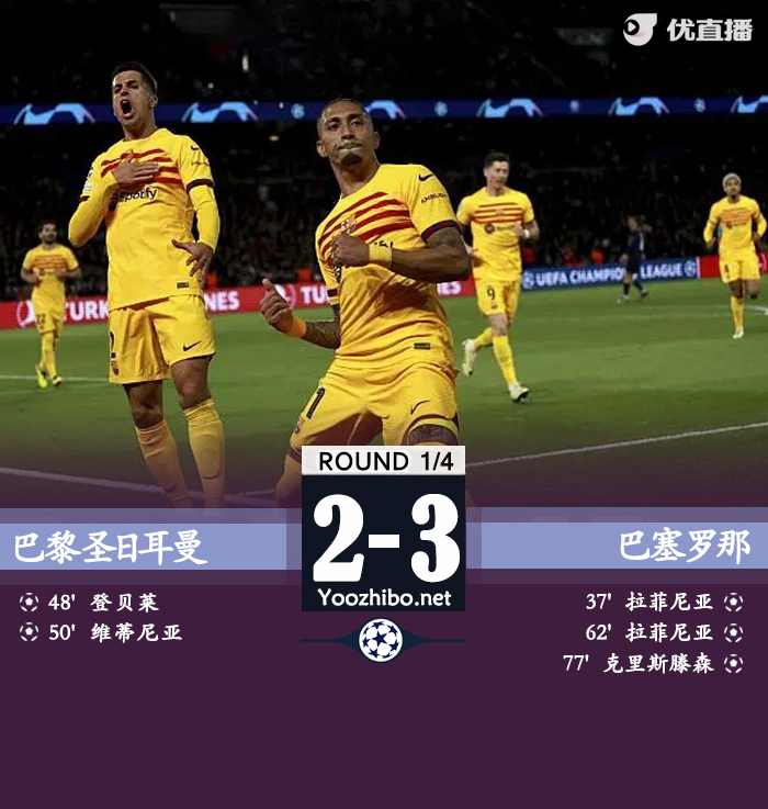 jrs直播网讯:北京时间4月11日欧冠1/4决赛首回合,巴黎圣日耳曼主场对阵巴塞罗那。上半场,亚马尔传中,多纳鲁马扑救不远,拉菲尼亚推射破门。下半场,登贝莱爆射破门。维蒂尼亚推射得分,巴黎两分钟迅速将比分反超。随后,佩德里助攻,拉菲尼亚不停球射门帮助巴萨扳平比分。京多安开出角球,刚刚替补登场的克里斯滕森头槌破门。全场比赛结束,巴萨客场3-2战胜巴黎,在淘汰赛中占得先机。