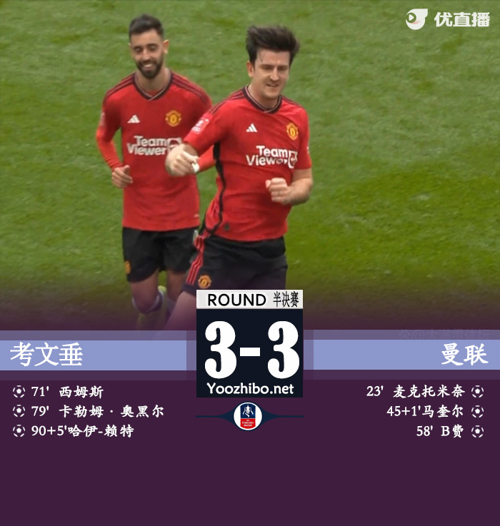 jrs直播网讯:北京时间4月21日22:30,足总杯半决赛在温布利大球场继续进行,曼联对阵英冠球队考文垂,本场主裁判为罗伯特-琼斯。上半场,麦克托米奈首开记录,B费角球助攻马奎尔头槌再下一城。下半场,B费破门帮助曼联三球领先;随后场上风云突变,西姆斯传射,奥哈雷远射变线入网,万-比萨卡补时送点,哈吉-赖特点射绝平,考文垂连扳三城奇迹般将比赛拖入加时赛。加时赛中,B费与西姆斯先后中楣,托尔普绝杀无效。点球大战中,卡塞米罗罚失,奥纳纳扑点,本-谢夫打飞,霍伊伦罚入制胜点球。最终,曼联总比分7-5惊险淘汰考文垂,与曼城会师足总杯决赛。
