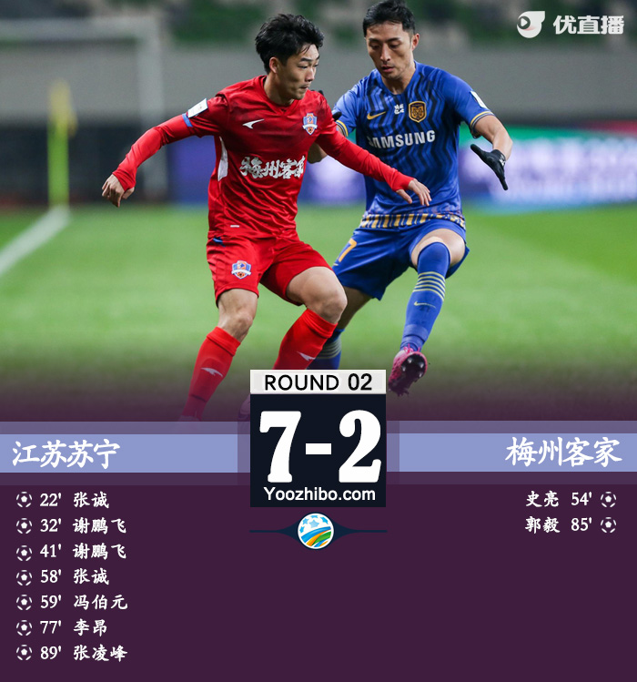 第63分钟,冯伯元禁区外围晃开防守,左脚打出一脚远射,皮球弹地窜进球门右下角,苏宁5-1梅州客家。第74分钟,张诚得球横敲,张晓彬直塞球,罗竞前插打门被挡出来。第76分钟,苏宁定位球机会,李昂主罚直接一脚电梯球打门,皮球贴着立柱入网,苏宁6-1继续扩大领先。第83分钟,梅州右路角球开出造成张晓彬手球犯规,梅州获得点球机会,郭毅主罚点球命中,梅州2-6苏宁。第88分钟,苏宁再入一球,黄紫昌插上后倒三角回传,张凌峰无人顶防头球破门!苏宁7-2锁定胜局。最终,全场比赛结束,苏宁7-2大胜梅州。