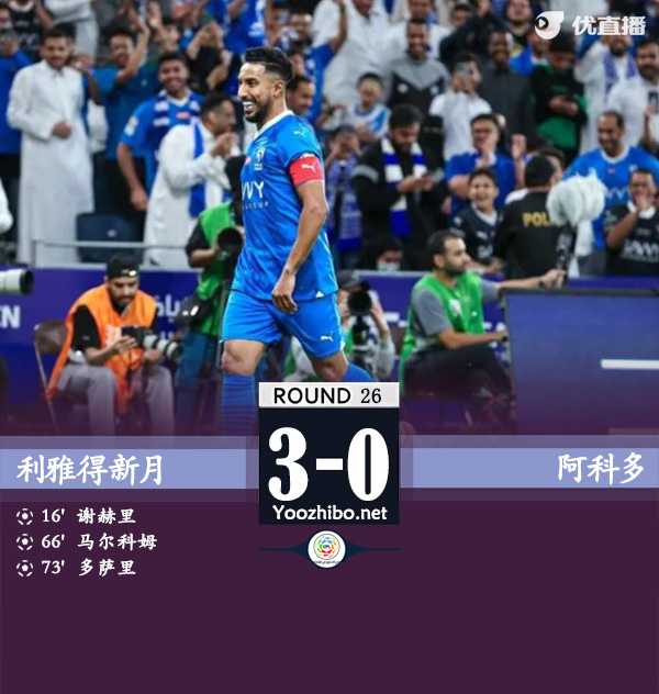 jrs直播网讯:北京时间4月3日03:00,沙特联赛第26轮利雅得新月迎战阿科多的比赛,上半场内维斯助攻谢赫里头球破门,科利亚多失单刀,下半场达瓦萨里助攻马尔科姆单刀破门,内维斯助攻多萨里推射扩大比分,最终利雅得新月3-0阿科多豪取31连胜12分领跑。