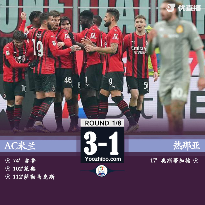 jrs直播网1月14日讯 北京时间1月14日凌晨4:00,意大利杯1/8决赛,AC米兰迎来热那亚的挑战。上半场波塔诺瓦利用角球机会助攻奥斯蒂加德破门,托莫里伤退,热那亚1-0暂时领先米兰;下半场吉鲁为米兰扳平比分,常规时间两队1-1战平;加时赛莱奥和萨勒马科尔斯建功,最终米兰加时3-1热那亚晋级八强。