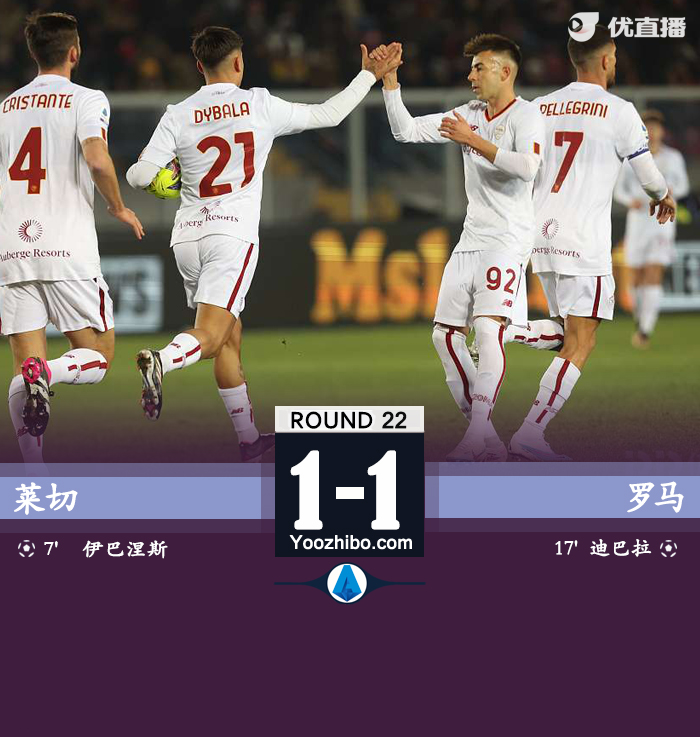 jrs直播网讯 北京时间2月12日凌晨1:00,意甲第22轮,罗马客场挑战莱切,上半场,伊巴涅斯自摆乌龙,斯莫林造点,迪巴拉点射破门扳平比分!下半场,双方均未能把握住进球机会。全场比赛结束,罗马1-1莱切!