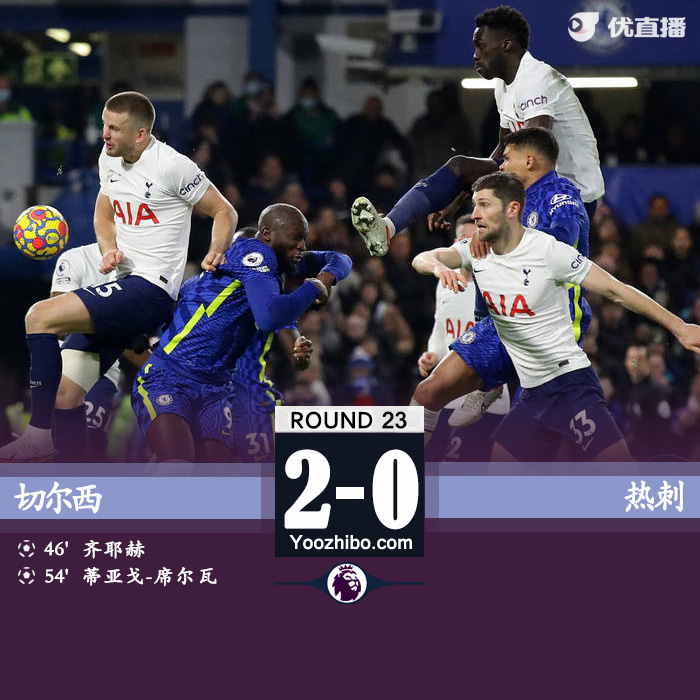 jrs直播网1月24日讯 北京时间1月24日0点30分,英超第23轮,切尔西对阵热刺。上半场双方拼抢激烈,切尔西局面占优,凯恩打进一球但犯规在先被吹掉。下半场刚开场1分钟齐耶赫就轰进一记世界波,蒂亚戈席尔瓦头球建功,全场比赛结束,切尔西2-0热刺,蓝军本赛季对热刺完成四杀。