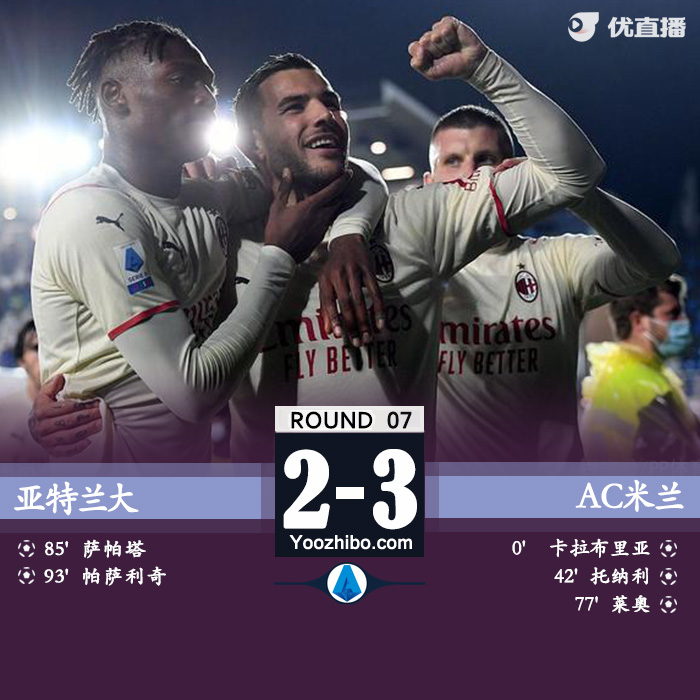 jrs直播网10月4日讯 北京时间10月04日星期一02:45,意甲第7轮亚特兰大对阵AC米兰。上半场,卡拉布里亚开场28秒超级闪击,托纳利破门,迈尼昂频频救险,AC米兰半场2-0领先亚特兰大。下半场,特奥奔袭助攻,莱奥破门,梅西亚斯手球被判罚点球,萨帕塔点射扳回一城,帕萨利奇补时再入一球。最终,AC米兰客场3-2战胜亚特兰大,红黑军团升至联赛第二。