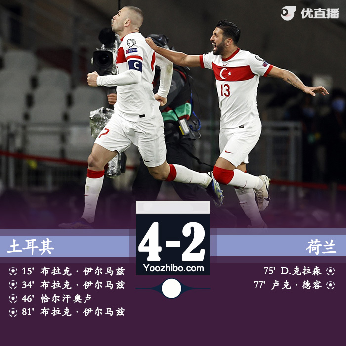 jrs直播网3月25日讯 北京时间3月25日1点,世预赛欧洲赛区G组荷兰客场对阵土耳其。上半场,伊尔马兹先是远射破门,随后他又打进点球,德里赫特头球中柱。下半场,恰尔汗奥卢轰进世界波,克拉森和卢克德容替补登场后在两分钟内连追两球,伊尔马兹任意球直接破门完成帽子戏法同时为土耳其锁定胜局,补时阶段卡巴克送点,恰基尔将点球扑出,全场比赛结束,土耳其4-2荷兰。