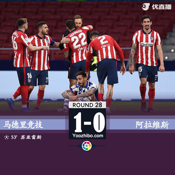 jrs直播网3月22日讯 北京时间3月22日1点3分,西甲第28轮马德里竞技主场对阵阿拉维斯。上半场,两队都没有创造出绝对有威胁的机会。下半场,苏亚雷斯头球攻门为马竞打破僵局,略伦特射中横梁,萨维奇送点,奥布拉克扑点,全场比赛结束,马德里竞技1-0阿拉维斯。