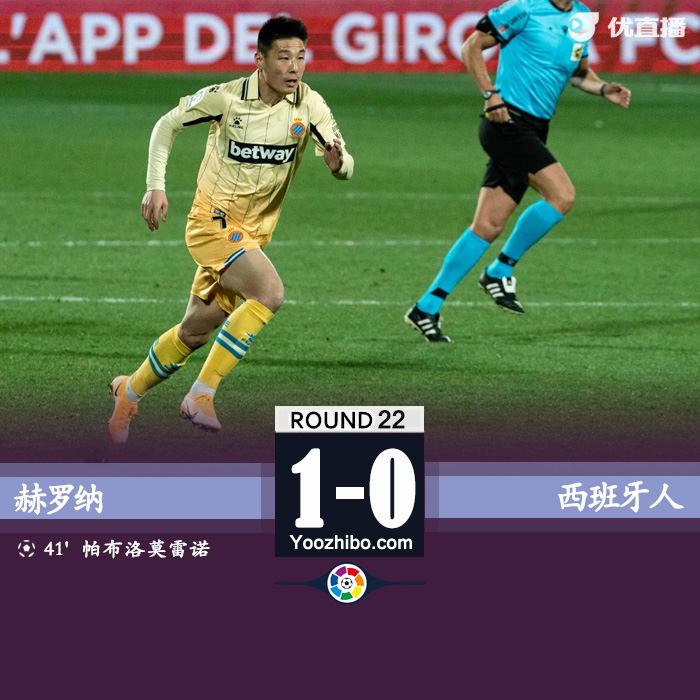 jrs直播网1月24日讯 北京时间1月24日01:15,西乙第22轮,西班牙人客场挑战赫罗纳。上半场,恩巴尔巴远射中柱,帕布洛-莫雷诺助赫罗纳取得领先;下半场,普阿多头球中柱,武磊第77分钟替补登场,但没有太多机会。最终,西班牙人客场0-1不敌赫罗纳。