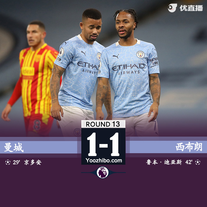 jrs直播网讯:北京时间12月16日4:00,英超第13轮,曼城迎战西布朗。上半时斯特林助京多安为曼城先拔头筹,尾声阶段阿雅伊造成鲁本-迪亚斯乌龙。下半时双方均无建树。最终,曼城1-1西布朗。