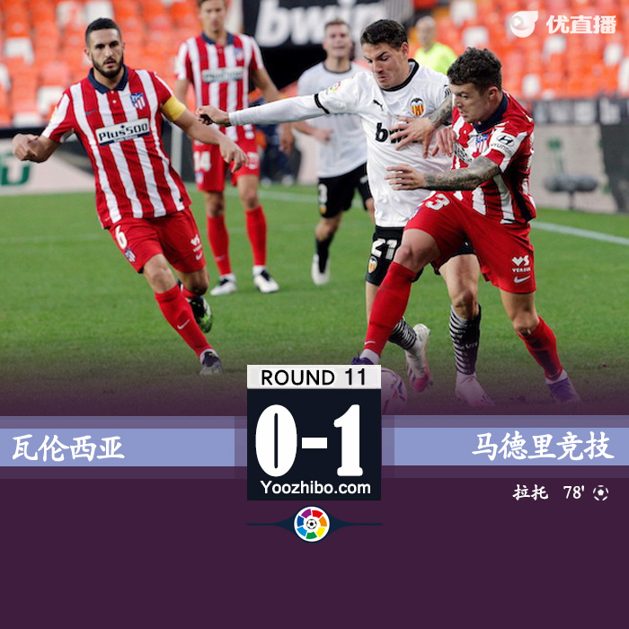 jrs直播网讯:北京时间11月28日23:15分进行西甲联赛第11轮,瓦伦西亚主场对阵马德里竞技。上半场比赛,勒马尔两脚高质量射门都被多梅内克飞身扑出,奥布拉克扑出拉契奇近距离的推射以及勒马尔的解围。下半场比赛,卡拉斯科传中造成拉托乌龙。全场比赛结束,马竞1-0战胜瓦伦西亚,取得联赛六连胜,少赛一轮的情况下23分追平联赛头名皇家社会,排名联赛第2。