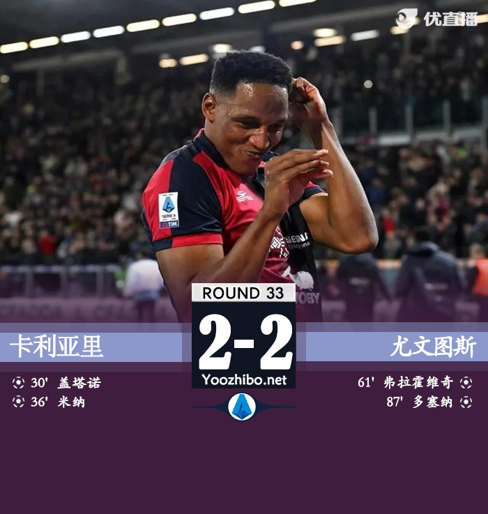 jrs直播网讯:北京时间4月20日,意大利足球顶级联赛第33轮,卡利亚里队主场迎战尤文图斯队。上半场,布雷默、什琴斯尼连续送点,加埃塔诺、米纳点射破门,基耶萨越位在先,弗拉霍维奇进球被吹。下半场,弗拉霍维奇任意球破门,伊尔迪兹传中造成多塞纳自摆乌龙,最终,尤文客场2-2卡利亚里。