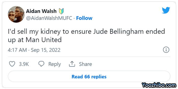 在本周三多特1-2不敌曼城的欧冠比赛中,贝林厄姆打入了球队的唯一进球,一度让大黄蜂取得领先。英格兰中场杀入禁区,接应队长马可·罗伊斯似传似射的助攻,头球冲顶破门。虽然多特最终惨遭逆转,但许多曼联球迷都希望贝林厄姆明夏加入球队,一名红魔拥趸甚至戏称愿意「卖肾」资助俱乐部引进他。