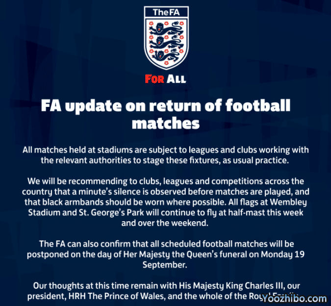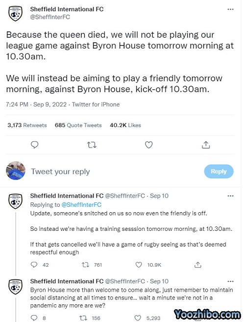 谢菲尔德国际决定在9月10日早上进行一场比赛,他们最开始称为了表达对于女王的尊重,决定取消比赛。不过很快谢菲尔德国际就安排了一场对同一个对手、同一个时间的友谊赛,等于是依旧要坚持在当天踢球。