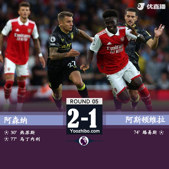 全场比赛结束,最终阿森纳2-1击败维拉。
