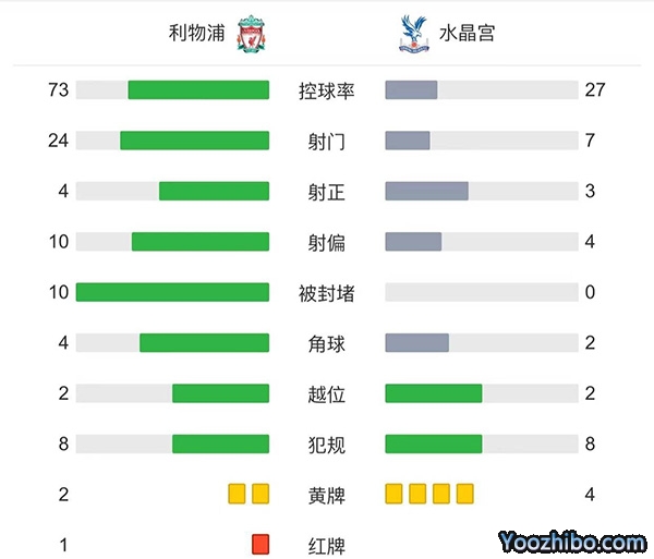 全场比赛结束,利物浦1-1水晶宫!