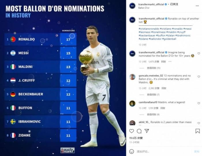 来源:jrs直播网10-31 11:11jrs直播网10月31日讯 金球奖不久后就要揭晓,今日,德转盘点了足球史上金球奖提名次数最多的球员,其中C罗17次位居第一,梅西第二。