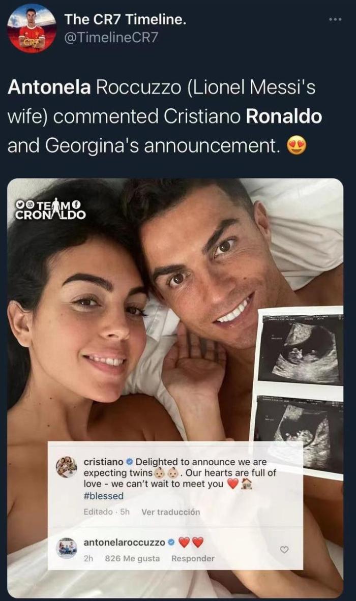 jrs直播网10月30日讯 ,C罗在个人社交媒体宣布乔治娜怀上双胞胎,随后梅西的妻子安东内拉送上祝福。