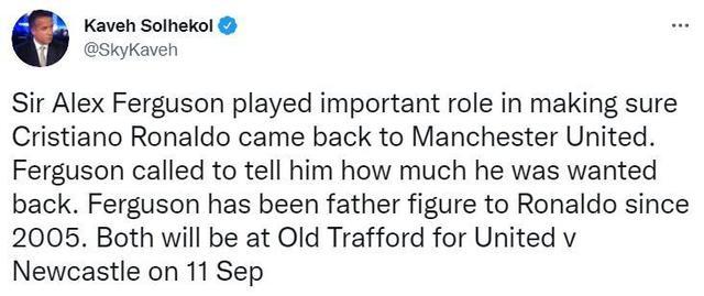 jrs直播网8月28日讯 据天空体育记者Kaveh Solhekol报道,弗格森在C罗回归曼联这笔交易中起了很大作用。