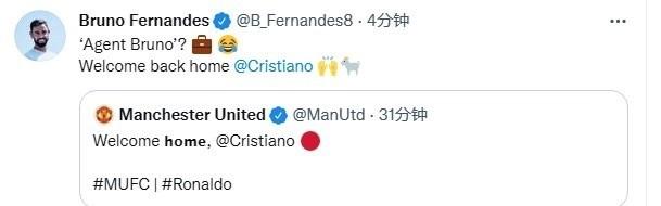 而C罗国家队队友B费则表示:“经纪人布鲁诺?欢迎克里斯蒂亚诺回家!”据悉,在这次C罗转会曼联的交易中,B费一直都在积极起到联络促进作用。新赛季葡萄牙国家队的两条“大腿”,将会在梦剧场携手为曼联重夺英超冠军助力。