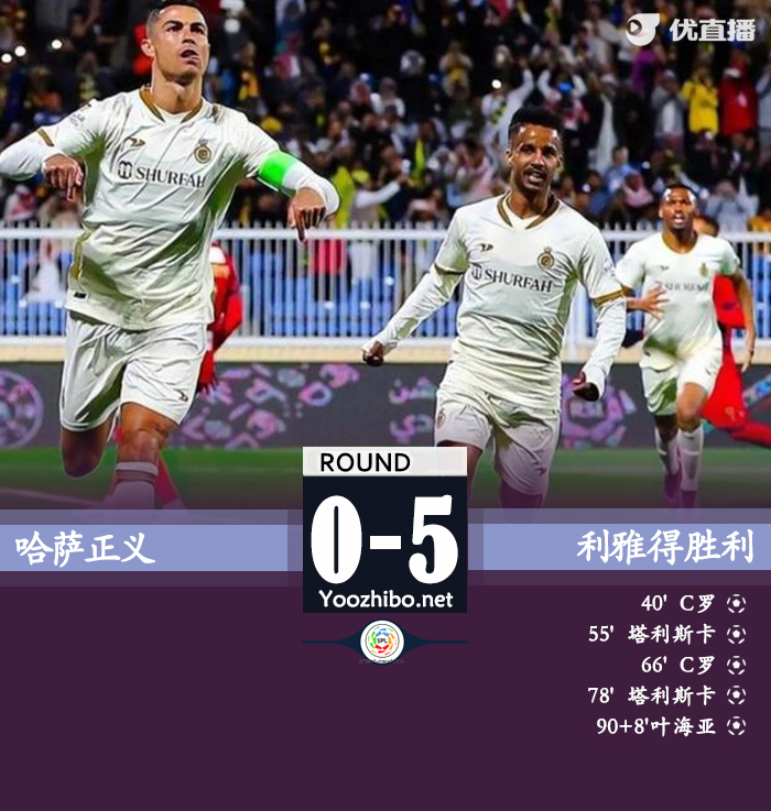 jrs直播网讯 北京时间4月5日03:00,沙特联赛第22轮利雅得胜利挑战哈萨正义的比赛,上半场阿姆里造点,C罗点射破门,下半场塔利斯卡、C罗均完成双响,叶海亚补射建功,最终利雅得胜利客场5-0大胜哈萨正义。