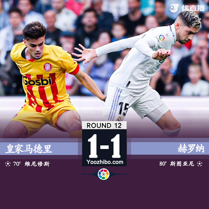 jrs直播网讯北京时间10月30日23点15分,西甲第12轮皇家马德里主场对阵赫罗纳。上半场,罗德里戈射中立柱,埃雷拉爆射回敬一脚门框。下半场,维尼修斯破门,阿森西奥送点,斯图尼亚点射扳平,罗德里戈进球被吹,克罗斯两黄变一红被罚下。全场比赛结束,皇家马德里1-1赫罗纳。