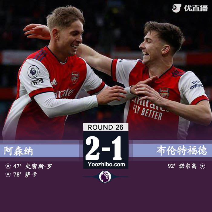 jrs直播网2月19日讯 北京时间2月19日23:00,英超联赛第26轮阿森纳主场迎战布伦特福德的比赛,上半场拉卡泽特进球被吹越位。半场阿森纳0-0布伦特福德。下半场史密斯罗闪击破门,萨卡爆射建功,补时阶段诺尔高扳回一城,最终阿森纳2-1布伦特福德。
