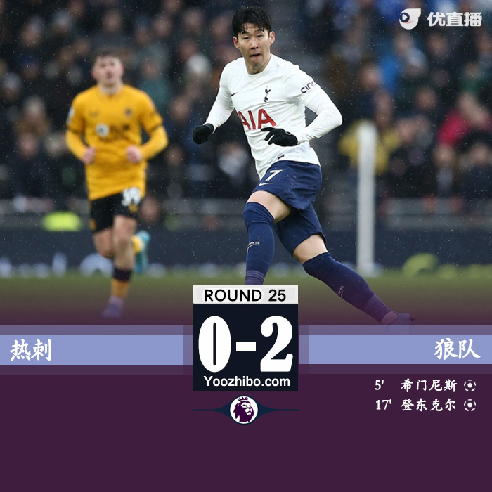 jrs直播网2月13日讯 北京时间2月13日22点,英超第25轮热刺对阵狼队。上半场,洛里多次贡献扑救但仍旧被希门尼斯和登东克尔通过补射各进一球,孙兴慜错失良机。下半场,热刺后防仍旧频频犯错,狼队连续错失良机,温克斯抽射中柱,全场比赛结束,热刺0-2狼队。