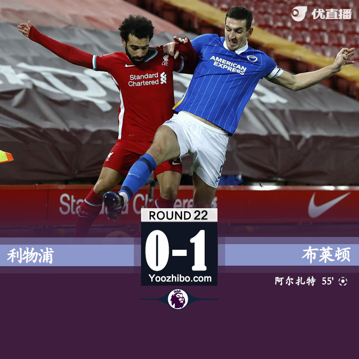 jrs直播网2月4日讯 北京时间2月4日凌晨4:15,英超联赛第22轮继续进行,利物浦坐镇主场迎战布莱顿。上半场,萨拉赫错失单刀,双方均无建树。下半场,阿尔萨特打破僵局,此后利物浦围攻未果。全场比赛结束,利物浦0-1不敌布莱顿,遭遇主场两连败。