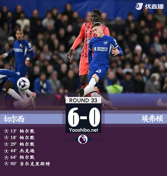 jrs直播网讯:北京时间4月16日,英格兰足球顶级联赛第33轮,切尔西在主场迎战埃弗顿。上半场,贝托近在咫尺空门打飞,雅克松助攻帕尔默远射入网,雅克松抽射被扑后帕尔默头球补射得手梅开二度,皮克福德乌龙助攻帕尔默吊射入网上演完美帽子戏法,杜库雷头球破门被判越位进球无效,库库雷利亚助攻雅克松停球打门得手;下半场,帕尔默造点并亲自罚进完成大四喜,奇尔韦尔射门被扑后吉尔克里斯特打进一线队首球。最终切尔西以6-0大胜埃弗顿。