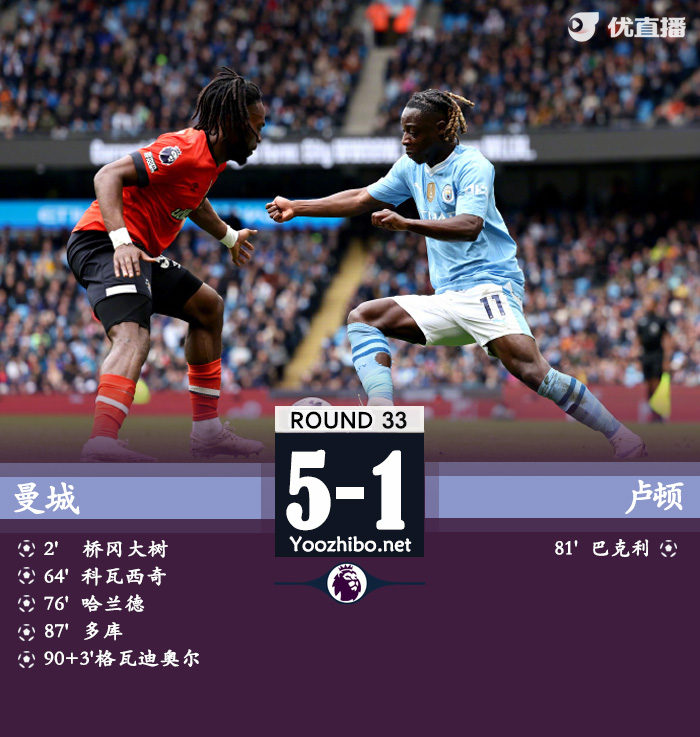 jrs直播网讯:北京时间4月13日22:00,英超第33轮继续进行,曼城坐镇主场阿提哈德球场迎战卢顿,本场主裁判为约翰-布鲁克斯。上半场,哈兰德开场凌空打门造桥冈大树乌龙。下半场,科瓦契奇爆杆破网,哈兰德点射,多库造点+个人秀建功+助攻格瓦迪奥尔破门,巴克利抓住努内斯的失误扳回一城。最终,曼城主场5-1大胜卢顿。