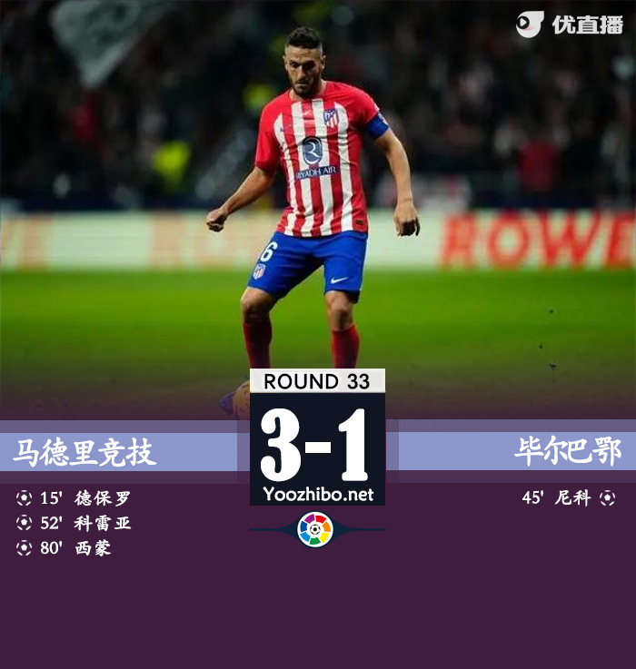 jrs直播网讯:北京时间4月28日03:00,西甲第33轮马竞迎战毕尔巴鄂的比赛,上半场德保罗凌空抽射破门,格列兹曼回传失误,尼科威廉姆斯推射扳平比分,下半场科克助攻科雷亚单刀反超比分,利诺爆射扩大比分,最终马竞3-1毕尔巴鄂领先第五名6分。