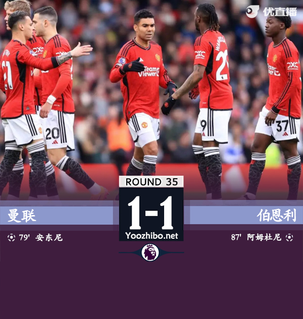 jrs直播网讯:北京时间4月27日,英超第35轮,曼联主场迎战伯恩利。上半场,B费小角度爆射中柱,奥纳纳贡献神扑+拒单刀。易边再战,安东尼屡失良机后破门收获个人赛季英超首球,奥纳纳送点阿姆杜尼点射扳平,麦克托米奈伤退。最终曼联1-1伯恩利。积分榜方面,曼联54分仍第六多赛两场距第五热刺6分,伯恩利24分仍倒数第二。