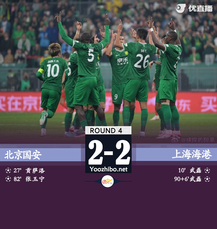 jrs直播网讯:北京时间4月5日中超 联赛 第4轮,北京国安主场对阵上海海港。上半场,武磊首开纪录,古加扳平比分,法比奥伤退;下半场,方昊造点,张玉宁点射反超比分,补时武磊完成绝平。最终,北京国安2-2战平上海海港。