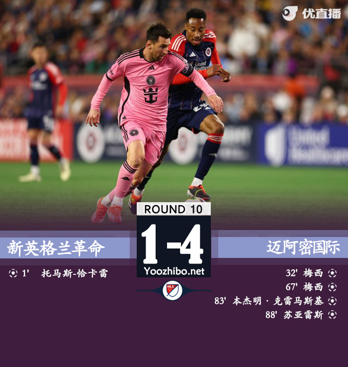 jrs直播网讯:北京时间4月28日7点30分,美职联第10轮,迈阿密国际客场对阵新英格兰革命。上半场,尚卡莱开场不到1分钟就破门,梅西单刀扳平比分。下半场,梅西完成双响,克雷马斯和苏亚雷斯先后进球锁定胜局。全场比赛结束,迈阿密国际4-1新英格兰革命继续领跑东区。梅西本场比赛完成双响后本赛季10场比赛打进11球,联赛7场9球领跑MLS射手榜,近3场连续破门。