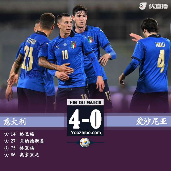 jrs直播网讯:北京时间11月12日3时45分(意大利当地时间11日20时45分),意大利在佛罗伦萨进行热身,最终4比0完胜爱沙尼亚。首秀前锋格里福梅开二度,贝尔纳代斯基和奥索利尼各下一城。巴斯托尼、卡拉布里亚、佩莱格里、佩西纳、卢卡-佩莱格里尼完成首秀。