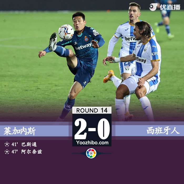 jrs直播网讯:北京时间11月27日2时(西班牙当地时间26日19时),西乙第14轮开始2场较量,西班牙人客场0比2负于莱加内斯,连续3轮不胜,被对方反超跌至第3位。武磊连续5轮担任替补,第66分钟替补出场。恩巴尔巴任意球中楣。巴斯通首开纪录,米格隆两黄下场,阿奈斯再下一城。